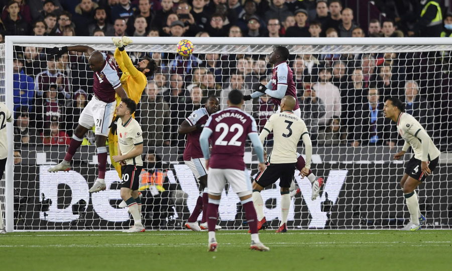 Soccer Football – Premier League – West Ham United v Liverpool – London Stadium, London, Britain – November 7, 2021 Liverpool’s Alisson scores an own goal and West Ham United’s first REUTERS/Tony Obrien EDITORIAL USE ONLY. No use with unauthorized audio, video, data, fixture lists, club/league logos or ‘live’ services. Online in-match use limited to 75 images, no video emulation. No use in betting, games or single club /league/player publications. Please contact your account representative for further details.
