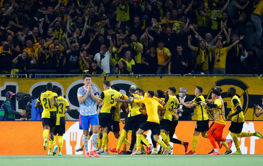 Soccer Football – Champions League – Group F – BSC Young Boys v Manchester United – Stadion Wankdorf, Bern, Switzerland – September 14, 2021 BSC Young Boys’ Jordan Siebatcheu celebrates scoring their second goal with teammates as Manchester United’s Harry Maguire looks dejected REUTERS/Arnd Wiegmann TPX IMAGES OF THE DAY