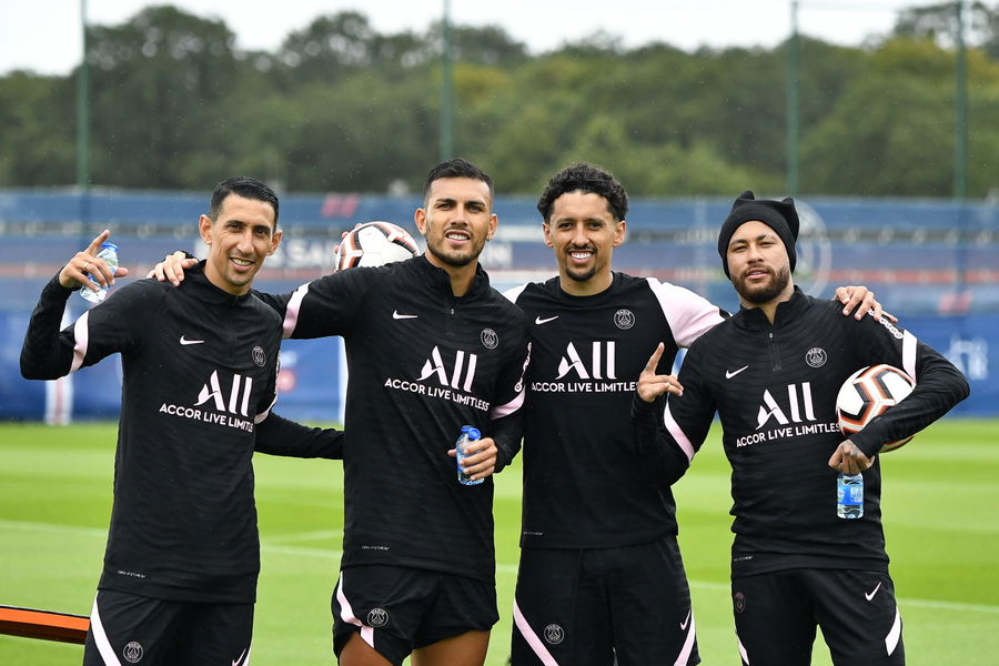PARIS, FRANCE – AUGUST 07: (L-R) Angel Di Maria, Leandro Paredes, Marquinhos and Neymar Jr pose during a Paris Saint-Germain training session at Ooredoo center on August 07, 2021 in Paris, France. (Photo by Aurelien Meunier – PSG/PSG via Getty Images)
