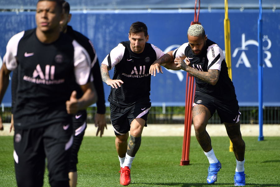 PARIS, FRANCE – AUGUST 19: Lionel Messi and Kylian Mbappe look on during a Paris Saint-Germain training session at Ooredoo Center on August 19, 2021 in Paris, France. (Photo by Aurelien Meunier – PSG/PSG via Getty Images)