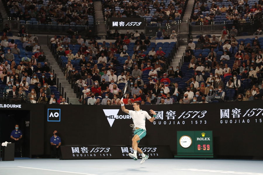 Tennis – Australian Open – Men’s Singles Final – Melbourne Park, Melbourne, Australia, February 21, 2021 Serbia’s Novak Djokovic in action during his final match against Russia’s Daniil Medvedev. Crowds are at a reduced capacity for this years event following the outbreak of the coronavirus disease (COVID-19) REUTERS/Asanka Brendon Ratnayake