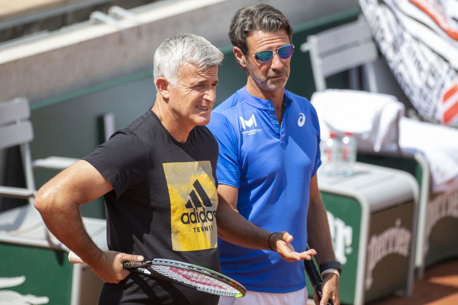 PARIS, FRANCE May 27. Apostolos Tsitsipas and Patrick Mouratoglou, coaches of Stefanos Tsitsipas of Greece watching him practice against Dominic Thiem of Austria on Court Suzanne Lenglen in preparation for the 2021 French Open Tennis Tournament at Roland Garros on May 27th 2021 in Paris, France. (Photo by Tim Clayton/Corbis via Getty Images)