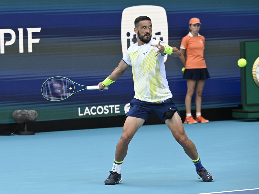 March 21, 2026, Miami Gardens, Florida, USA: DAMIR DZUMHUR BIH hits a forehand, during his match against Jannik Sinner ITA in a second round Men s Singles match against at the Miami Open at Hard Rock Stadium in Miami Gardens. Sinner defeated Dzumhur 6-3, 6-3. Tennis 2026: Miami Open: SINNER 6-3, 6-3 DZUMHUR PUBLICATIONxINxGERxSUIxAUTxONLY – ZUMAsd3_ 20260321_znp_sd3_137 Copyright: xMichelexEvexSandbergx
