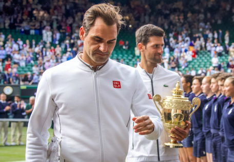 Roger Federer of Switzerland and Novak Djokovic of Serbia hold their trophies as they walk off Centre Court after the Men’s Singles Final during the Wimbledon Lawn Tennis Championships at the All England Lawn Tennis and Croquet Club at Wimbledon on July 14, 2019 in London, England.