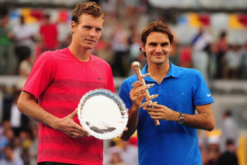 Tomas Berdych and Roger Federer during Mutua Madrid Open 2012