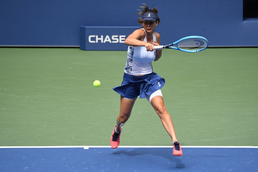Sep 9 2020; Flushing Meadows, New York,USA; Tsvetana Pironkova of Bulgaria hits a forehand against Serena Williams of the United States (not pictured) in a women’s singles quarter-finals match on day nine of the 2020 U.S. Open tennis tournament at USTA Billie Jean King National Tennis Center. Mandatory Credit: Danielle Parhizkaran-USA TODAY Sports