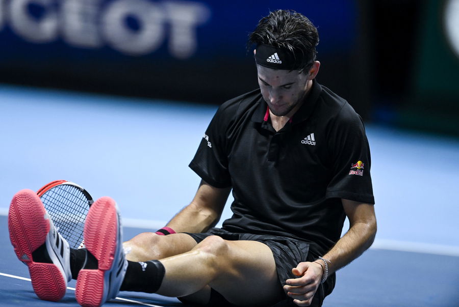 LONDON, ENGLAND – NOVEMBER 22: Dominic Thiem of Austria falls over during his match against Daniil Medvedev of Russia on Day 8 of the Nitto ATP World Tour Finals at The O2 Arena on November 22, 2020 in London, England. (Photo by TPN/Getty Images)