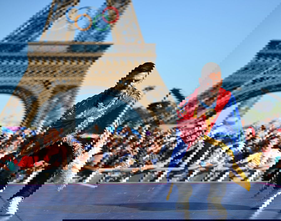 240805 — PARIS, Aug. 5, 2024 — Serbian tennis super star Novak Djokovic, who claimed gold in the tennis men s singles at the Paris Olympics, poses for a photo with the Eiffel Tower at the Champions Park for the Paris 2024 Olympic Games, Olympische Spiele, Olympia, OS in Paris, France, Aug. 5, 2024. PARIS2024 FRANCE-PARIS-OLY-CHAMPIONS PARK HexCanling PUBLICATIONxNOTxINxCHN
