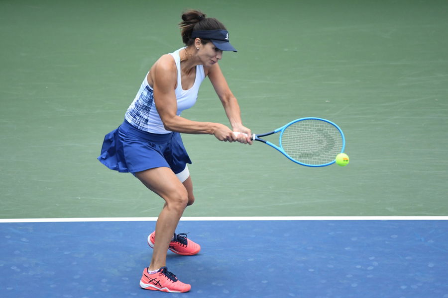 Sep 7, 2020; Flushing Meadows, New York, USA; Tsvetana Pironkova of Bulgaria hits a backhand against Alize Cornet of France (not pictured) on day eight of the 2020 U.S. Open tennis tournament at USTA Billie Jean King National Tennis Center. Mandatory Credit: Danielle Parhizkaran-USA TODAY Sports