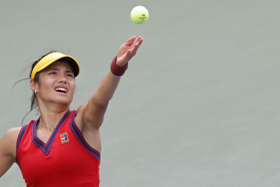 Aug 31, 2021; Flushing, NY, USA; Emma Raducanu of Great Britain serves against Stefanie Voegele of Switzerland (not pictured) on day two of the 2021 U.S. Open tennis tournament at USTA Billie King National Tennis Center. Mandatory Credit: Geoff Burke-USA TODAY Sports