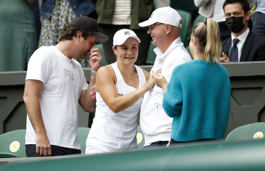 LONDON, ENGLAND – JULY 10: Ashleigh Barty of Australia celebrates with coach Craig Tyzzer after winning her Ladies’ Singles Final match against Karolina Pliskova of The Czech Republic on Day Twelve of The Championships – Wimbledon 2021 at All England Lawn Tennis and Croquet Club on July 10, 2021 in London, England. (Photo by Peter Nicholls – Pool/Getty Images)