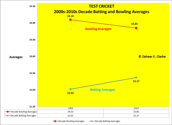 Beginning in 1983 and eventually adopted in 1985 by all Test nations, extras, specifically no-balls and wides were charged to both bowlers and the bowling team. Prior to this, bowlers were only charged with runs scored off the bat with no-balls or wides charged to the bowling team only. This explains why when batting averages decreased from the 1970s (30.76) to the 1980s (30.45), we saw a slight increase in the bowling averages from 31.90 to 32.09.