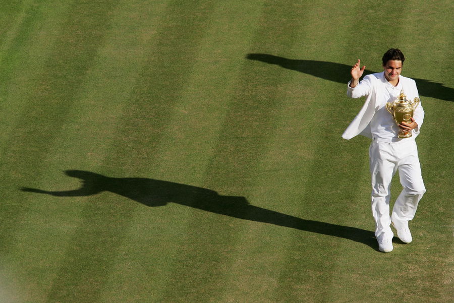 LONDON – JULY 08: Roger Federer of Switzerland parades the trophy as he celebrates victory following the Men’s Singles final match against Rafael Nadal of Spain during day thirteen of the Wimbledon Lawn Tennis Championships at the All England Lawn Tennis and Croquet Club on July 8, 2007, in London, England. Roger Federer claims his fifth consecutive championship title. (Photo by Alex Livesey/Getty Images)