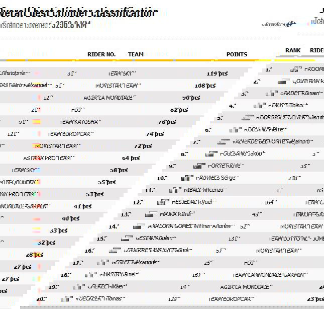 In the Yellow Jersey group, Froome had Wouter Poels and Richie Porte to support him. Quintana continued to attack but his teammates were able to initially drag the explosive Colombian rider back. Valverde attacked, and was soon joined by Quintana as they both worked hard to open a large lead over Sky. Quintana who charged forward and was soon supported by teammate and compatriot, Winner Anacona who was in the leading breakaway. Quintana once again surged forward as he tried to pass Thibaut Pinot, the first place could award 10 bonus seconds. However, he managed to finish 18 seconds down on Pinot in second. Froome thanks to assistance of his team, managed to claw his way back at a gradual pace to finish 1’38” down on Quintana. He would maintain a 1’12” lead overall.