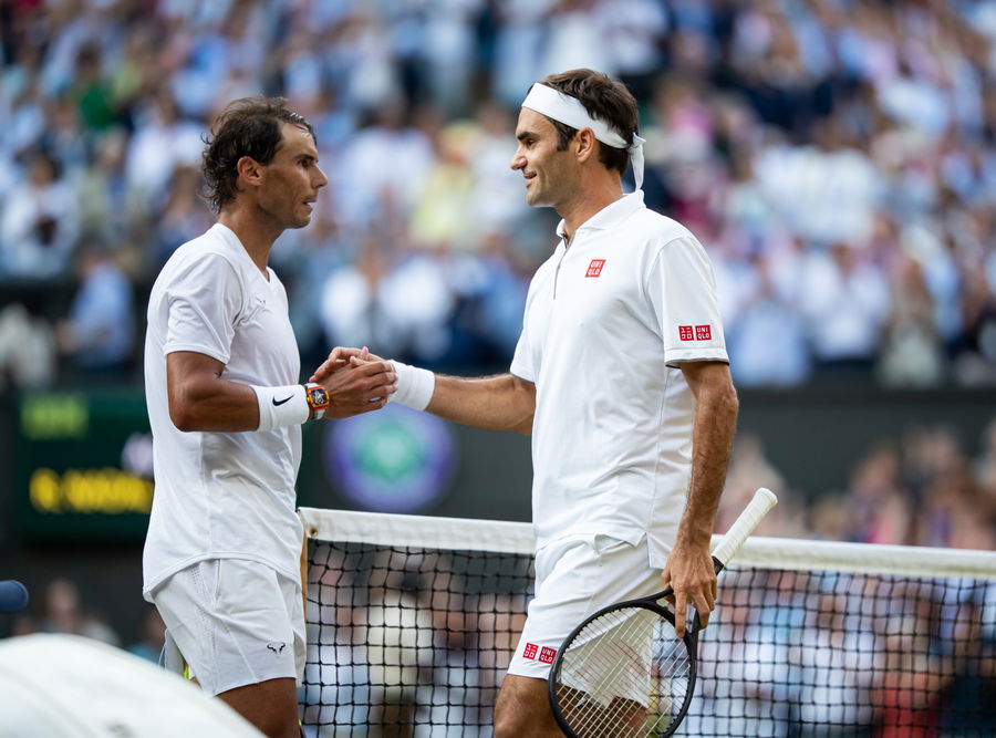 Roger Federer of Switzerland shakes hands with Rafael Nadal at Wimbledon. (Photo by Simon Bruty/Anychance/Getty Images)