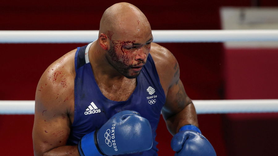 Tokyo 2020 Olympics – Boxing – Men’s Super Heavyweight – Semifinal – Kokugikan Arena – Tokyo, Japan – August 4, 2021. Frazer Clarke of Britain sustains an injury during his fight against Bakhodir Jalolov of Uzbekistan REUTERS/Carl Recine