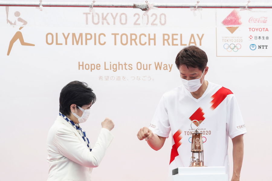 Shuzo Matsuoka, Tokyo?s first torchbearer, exchange greetings with Tokyo governor Yuriko Koike before he leaves the stage with the Olympic torch lantern at the Tokyo 2020 Torch Relay, in Tokyo, Japan July 9, 2021. REUTERS/Kim Kyung-Hoon