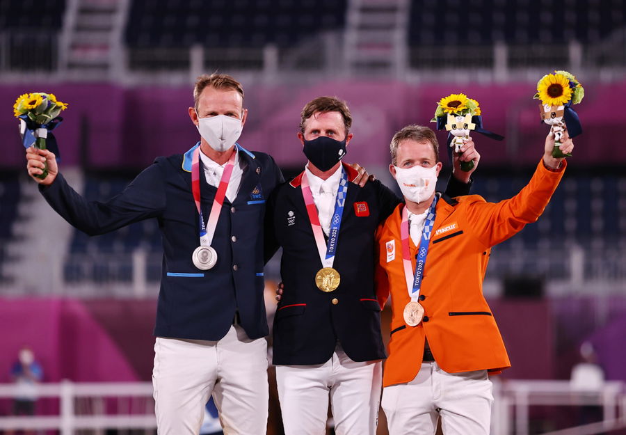 Tokyo 2020 Olympics – Equestrian – Jumping – Individual – Medal Ceremony – Equestrian Park – Tokyo, Japan – August 4, 2021. Gold medallist Ben Maher of Britain poses with silver medallist Peder Fredricson of Sweden and bronze medallist Maikel van der Vleuten of the Netherlands. REUTERS/Amr Abdallah Dalsh