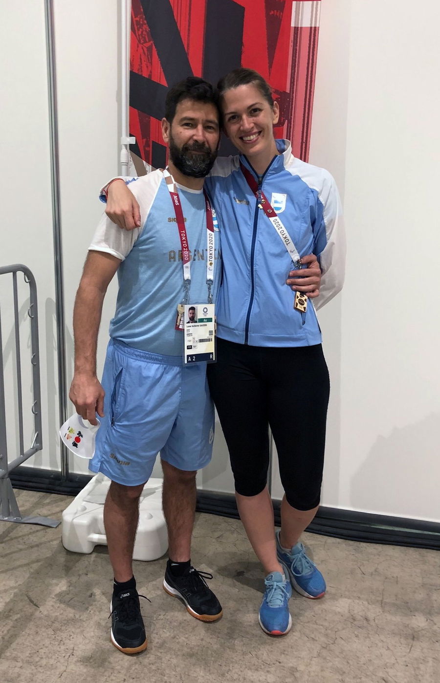 Argentine fencer Maria Belen Perez Maurice hugs her coach of 17 years, Lucas Guillermo Saucedo, after he proposed marriage to her on the sidelines of the Olympic fencing at Makuhari Messe Hall in Chiba, Japan July 26, 2021. Picture taken July 26, 2021. REUTERS/Sakura Murakami