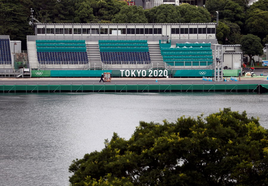 Construction workers are seen at the waterfront area at Odaiba Marine Park in preparation for the Tokyo 2020 Olympic Games that have been postponed to 2021 due to the coronavirus disease (COVID-19) outbreak, in Tokyo, Japan June 22, 2021. REUTERS/Issei Kato