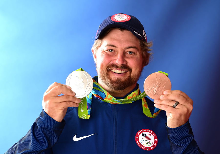 RIO DE JANEIRO, BRAZIL – AUGUST 13: (BROADCAST – OUT) Archer, Brady Ellison of the United States poses for a photo with his bronze and silver medals on the Today show set on Copacabana Beach on August 13, 2016 in Rio de Janeiro, Brazil. (Photo by Harry How/Getty Images)