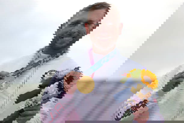 ASAKA, JAPAN – JULY 26: Gold Medalist Vincent Hancock of Team United States poses following the Skeet Men’s Finals on day three of the Tokyo 2020 Olympic Games at Asaka Shooting Range on July 26, 2021 in Asaka, Saitama, Japan. (Photo by Kevin C. Cox/Getty Images)