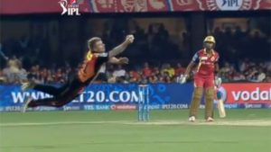On the last ball of the 12th over, a Ravi Bopara delivery was hit by Royal Challengers Bangalore player Mandeep Singh and it was a leading edge. Reacting quickly, Sunrisers Hyderabad player David Warner dove and took an absolute blinder of a catch. RCB were are 93 for the loss of 3 at that time and Mandeep was dismissed for a duck.