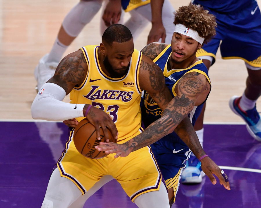 Jan 18, 2021; Los Angeles, California, USA; Golden State Warriors guard Kelly Oubre Jr. (12) tries to knock the ball away from Los Angeles Lakers forward LeBron James (23) during the first quarter at Staples Center. Mandatory Credit: Robert Hanashiro-USA TODAY Sports