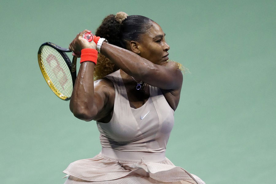 NEW YORK, NEW YORK – SEPTEMBER 10: Serena Williams of the United States returns the ball during her Women’s Singles semifinal match against Victoria Azarenka of Belarus on Day Eleven of the 2020 US Open at the USTA Billie Jean King National Tennis Center on September 10, 2020, in the Queens borough of New York City. (Photo by Matthew Stockman/Getty Images)