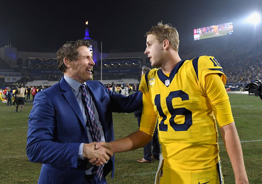 LOS ANGELES, CA – NOVEMBER 19: Former NFL quarterback Steve Young (L) congratulates quarterback Jared Goff #16 of the Los Angeles Rams after the Rams defeated the Kansas City Chiefs with the score of 54-51 at Los Angeles Memorial Coliseum on November 19, 2018 in Los Angeles, California. (Photo by Kevork Djansezian/Getty Images)