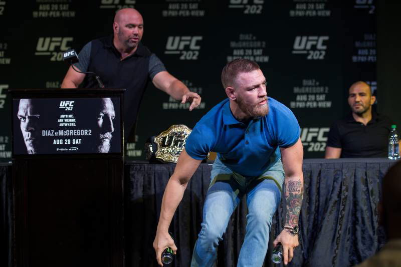 During the pre-fight press conference, Conor was late to the event, which eventually led Nate Diaz to walk off from the venue right before Conor arrives on the stage. During Diaz’s walk-off, both teams threw water bottles at each other. McGregor picked up monster energy cans from the table and threw it at Diaz’s team.