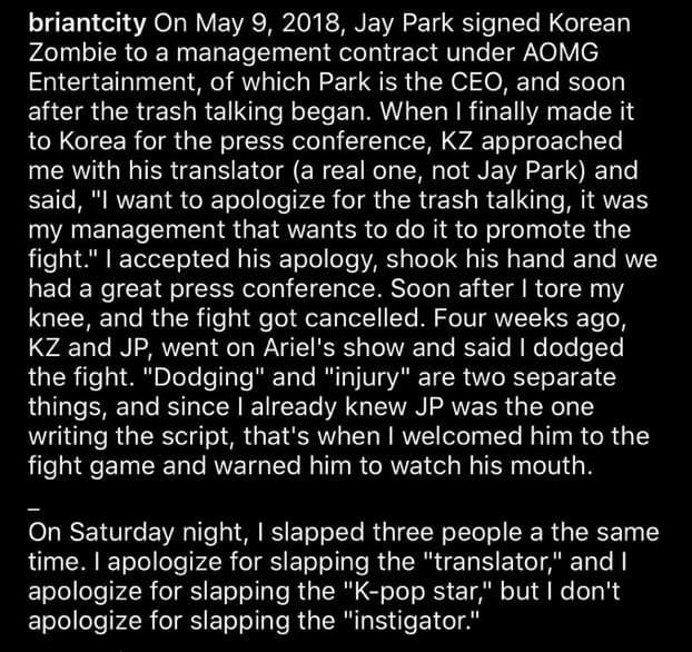 “He’s like the No. 2 guy in the world, a UFC professional fighter. What is he doing coming and attacking me?… I’m a singer, bro. I weigh 143 pounds. I’m like 40 pounds lighter than you. He’s the No. 2 UFC dude in the world. It doesn’t make you look tough.”- Jay Park