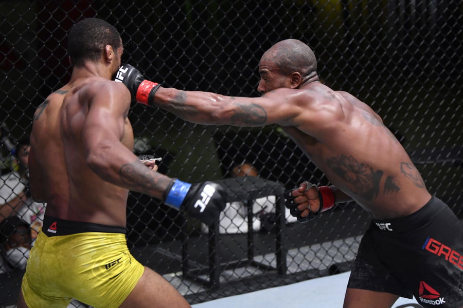 LAS VEGAS, NEVADA – OCTOBER 31: (R-L) Bobby Green punches Thiago Moises of Brazil in a lightweight bout during the UFC Fight Night event at UFC APEX on October 31, 2020 in Las Vegas, Nevada. (Photo by Jeff Bottari/Zuffa LLC)