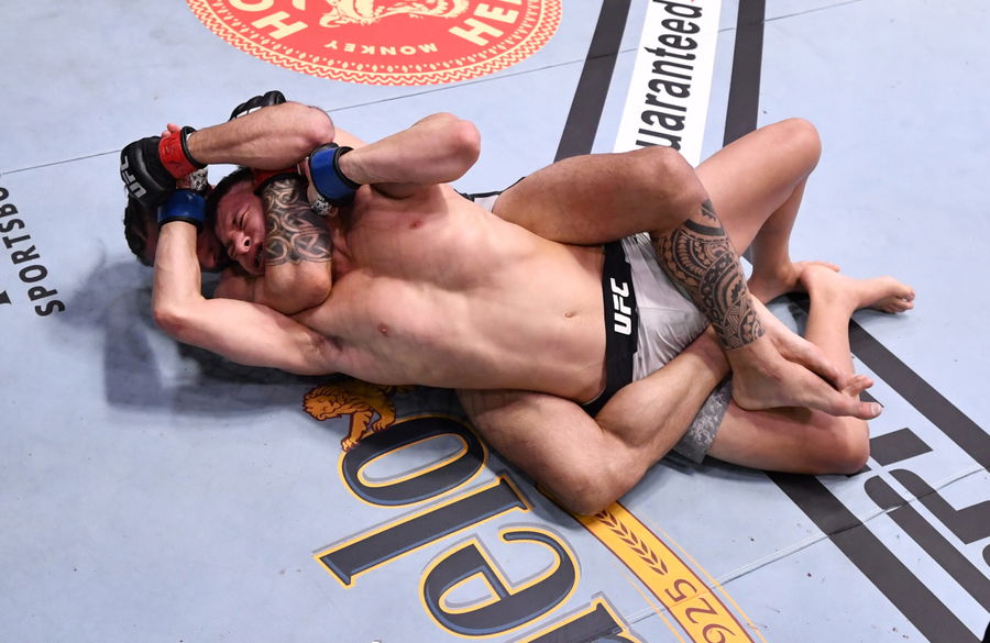 LAS VEGAS, NEVADA – MARCH 06: (L-R) Rogerio Bontorin of Brazil attempts to secure a rear choke against Kai Kara-France of New Zealand in their flyweight fight during the UFC 259 event at UFC APEX on March 06, 2021 in Las Vegas, Nevada. (Photo by Jeff Bottari/Zuffa LLC)