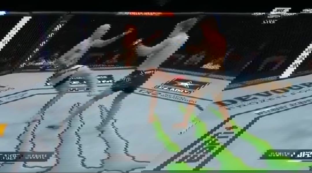 Meanwhile, Crute kept plucking away with some shots here and there, but consistently hit some good leg kicks. However, his kicks weren’t the ones that landed the major damage. Smith landed his first kick of the fight as his toe connected with Crute’s knee.
