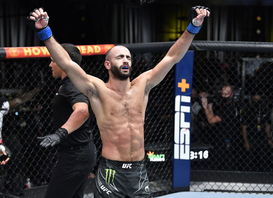 LAS VEGAS, NEVADA – AUGUST 28: Giga Chikadze of Georgia reacts after his knockout victory over Edson Barboza of Brazil in a featherweight fight during the UFC Fight Night event at UFC APEX on August 28, 2021 in Las Vegas, Nevada. (Photo by Chris Unger/Zuffa LLC)