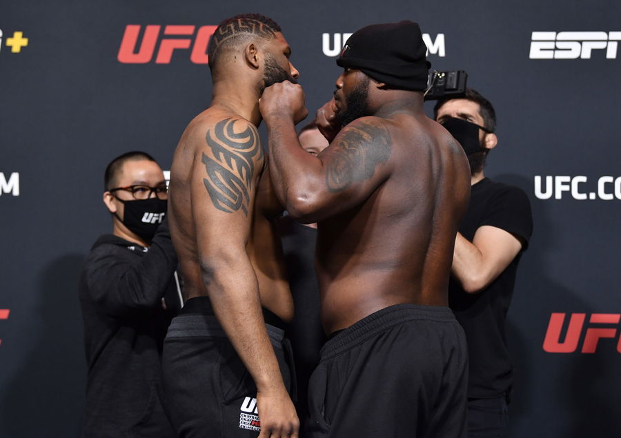 LAS VEGAS, NEVADA – FEBRUARY 19: (L-R) Opponents Curtis Blaydes and Derrick Lewis face off during the UFC weigh-in at UFC APEX on February 19, 2021 in Las Vegas, Nevada. (Photo by Chris Unger/Zuffa LLC)