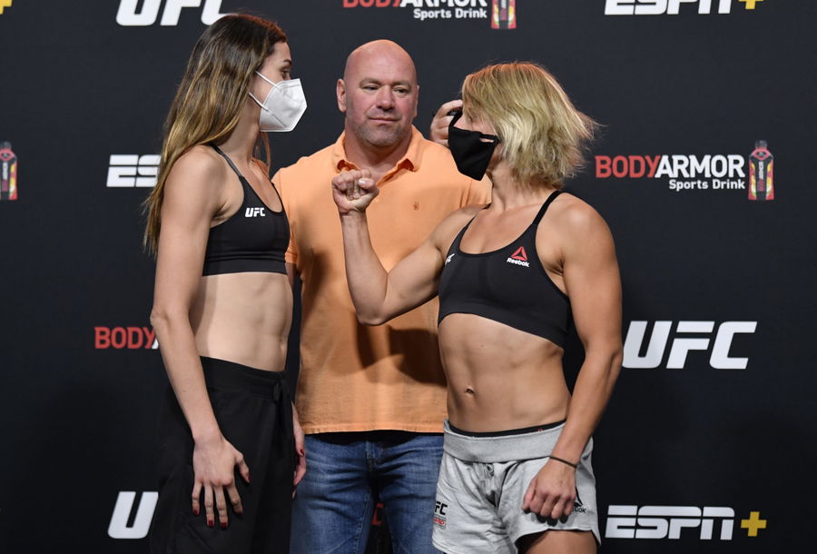 LAS VEGAS, NEVADA – SEPTEMBER 11: (L-R) Opponents Sabina Mazo of Colombia and Justine Kish of Russia face off during the UFC Fight Night weigh-in at UFC APEX on September 11, 2020, in Las Vegas, Nevada. (Photo by Jeff Bottari/Zuffa LLC)