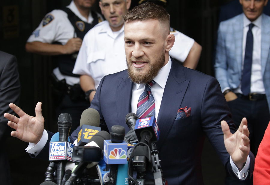 Conor McGregor speaks to the media after he pleads guilty only to a disorderly conduct violation in New York City on July 26, 2018. UFC star Conor McGregor pleaded guilty to a single violation of disorderly conduct in Brooklyn criminal court on Thursday for his involvement in an incident on April 5 at Barclays Center. Conor McGregor will not be serving jail time for his actions prior to UFC 223 and his travel visa will not be affected clearing his way to resume his MMA career. PUBLICATIONxINxGERxSUIxAUTxHUNxONLY NYP20180726121 JOHNxANGELILLO