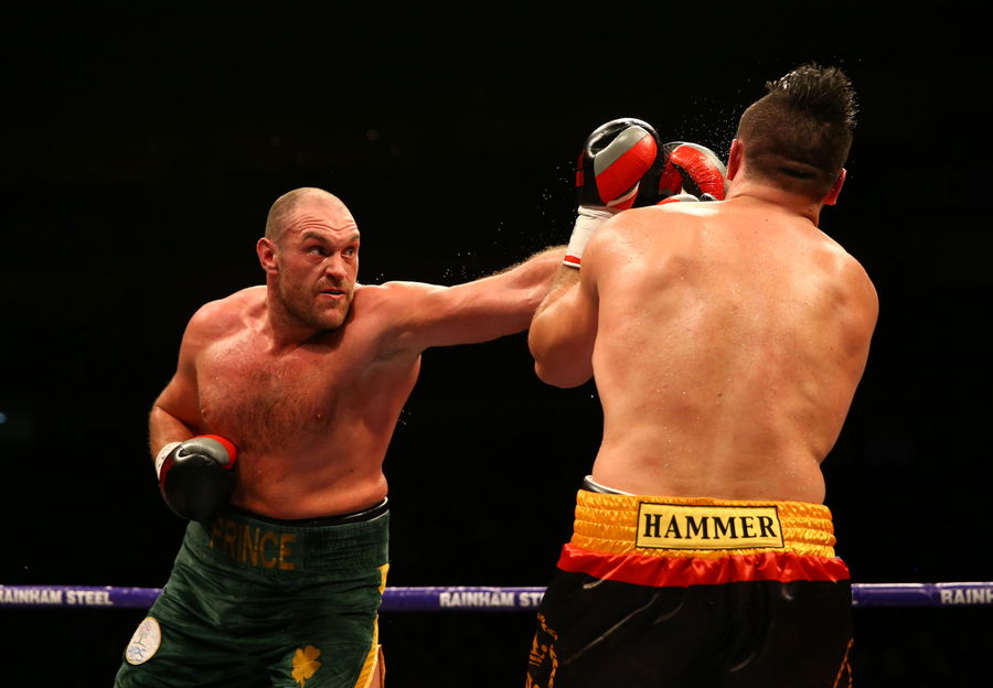 LONDON, ENGLAND – FEBRUARY 28: Tyson Fury (green shorts) on his way to victory over Christian Hammer in a Heavyweight Contest by singing ‘Elvis’ at the O2 Arena on February 28, 2015 in London, England. (Photo by Richard Heathcote/Getty Images)