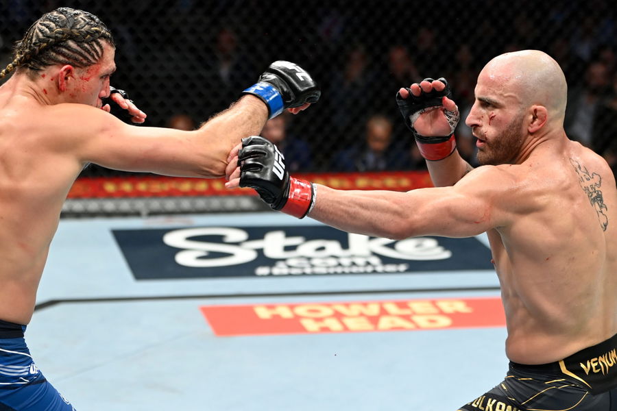 LAS VEGAS, NV – SEPTEMBER 25: (L-R) Alexander Volkanovski in their featherweight fight during UFC 266 on September 25, 2021, at T-Mobile Arena in Las Vegas, NV. (Photo by Louis Grasse/PxImages/Icon Sportswire via Getty Images)