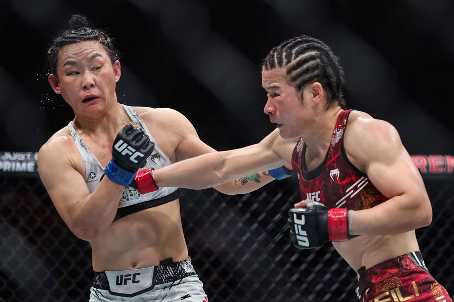 LAS VEGAS, NEVADA – APRIL 13: Zhang Weili of China and Yan Xiaonan of China exchange strikes during their strawweight championship title fight at T-Mobile Arena on April 13, 2024 in Las Vegas, Nevada. (Photo by Carmen Mandato/Getty Images)