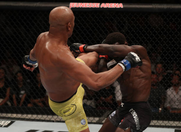 RIO DE JANEIRO, BRAZIL – MAY 11: (L-R) Anderson Silva of Brazil kicks Jared Cannonier in their middleweight bout during the UFC 237 event at Jeunesse Arena on May 11, 2019 in Rio De Janeiro, Brazil. (Photo by Buda Mendes/Zuffa LLC/Zuffa LLC via Getty Images)