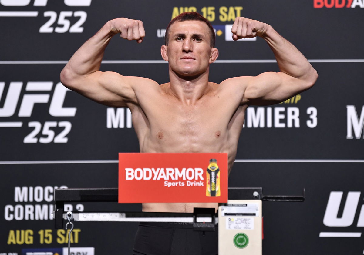 LAS VEGAS, NEVADA – AUGUST 14: Merab Dvalishvili of Georgia poses on the scale during the UFC 252 weigh-in at UFC APEX on August 14, 2020 in Las Vegas, Nevada. (Photo by Jeff Bottari/Zuffa LLC)
