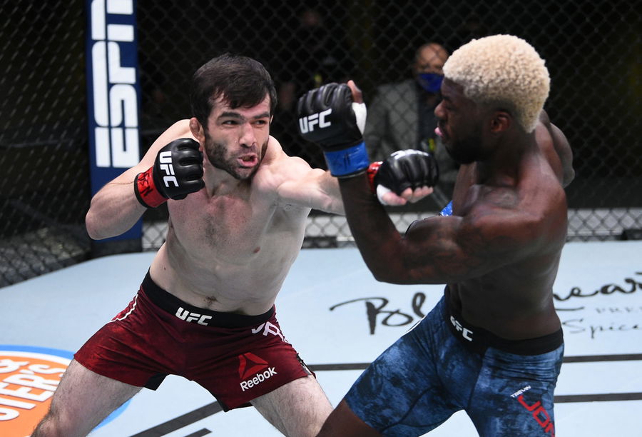 LAS VEGAS, NEVADA – AUGUST 22: (L-R) Timur Valiev of Russia punches Trevin Jones in their fight during the UFC Fight Night event at UFC APEX on August 22, 2020 in Las Vegas, Nevada. (Photo by Chris Unger/Zuffa LLC)