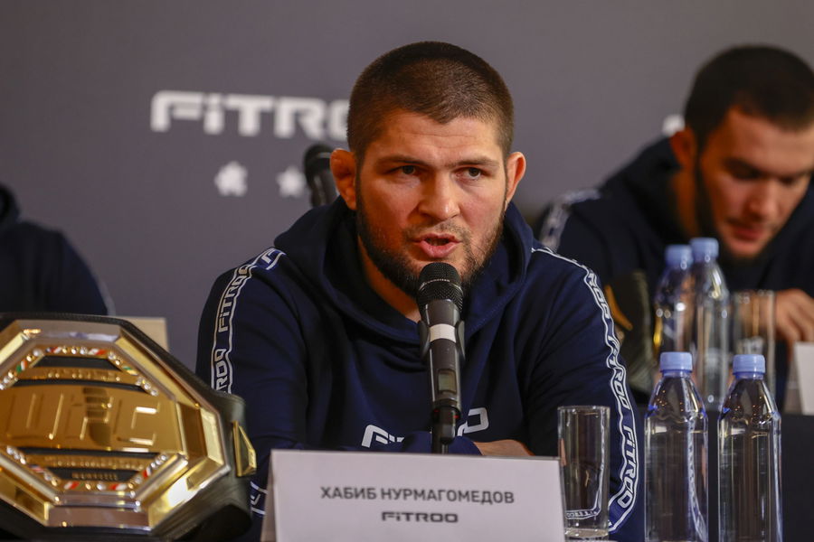 MOSCOW,RU8SSIA – DECEMBER 13: Former Russian mixed martial arts (MMA) fighter, UFC lightweight titleholder Khabib Nurmagomedov holds a press conference in Moscow, Russia on December 13, 2021. (Photo by Sefa Karacan/Anadolu Agency via Getty Images)