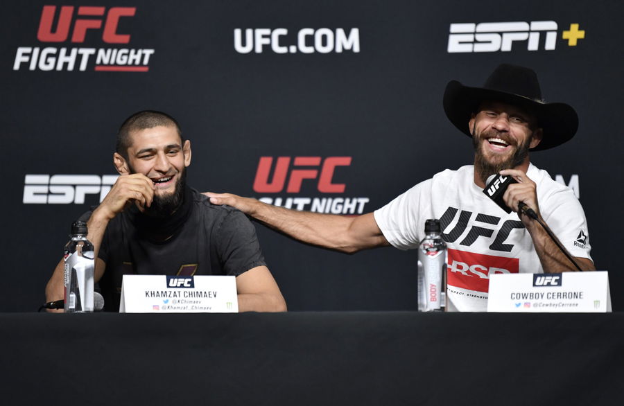 LAS VEGAS, NEVADA – SEPTEMBER 17: (R-L) Donald Cerrone and Khamzat Chimaev of Chechnya interact with media during the UFC Fight Night press conference at UFC APEX on September 17, 2020 in Las Vegas, Nevada. (Photo by Jeff Bottari/Zuffa LLC)