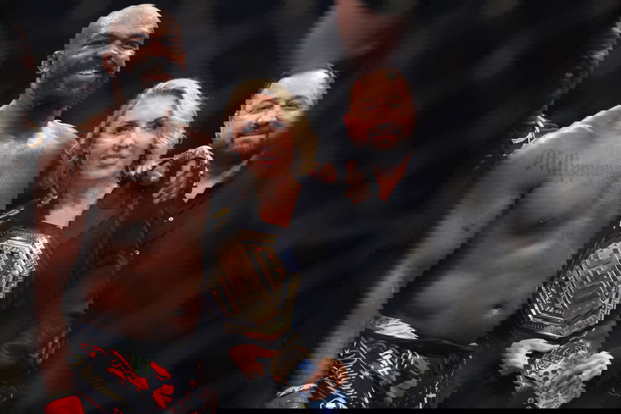 November 17, 2024: El campeo³n de peso pesado de UFC, Jon Jones, con su prometida Jessie Moses, celebra su victoria por nocaut to cnico contra el retador Stipe Miocic durante su pelea por el totulo de peso pesado de UFC 309. – ZUMAla2_ 0779969143st Copyright: xKenaxBetancurx