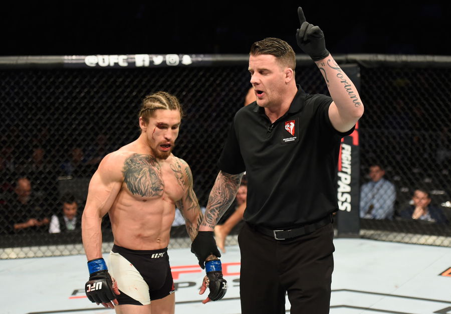 LAS VEGAS, NV – MARCH 04: (R-L) Referee Marc Goddard deducts a point from Luke Sanders after an illegal blow against Iuri Alcantara of Brazil in their bantamweight bout during the UFC 209 event at T-Mobile Arena on March 4, 2017 in Las Vegas, Nevada. (Photo by Josh Hedges/Zuffa LLC/Zuffa LLC via Getty Images)
