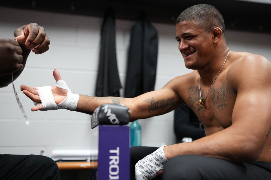 JACKSONVILLE, FLORIDA – APRIL 09: Gilbert Burns of Brazil has his hands wrapped prior to his fight during the UFC 273 event at VyStar Veterans Memorial Arena on April 09, 2022 in Jacksonville, Florida. (Photo by Cooper Neill/Zuffa LLC)